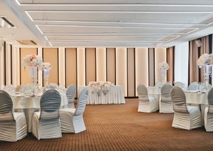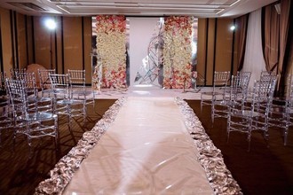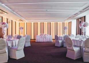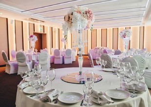 Просторный зал подойдет для шикарной свадьбы. Если молодожены задумают пожениться летом, то можно провести выездную регистрацию на крыше первого этажа отеля, где располагается летняя веранда с красивым видом на город.