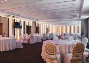 Помещение вместимостью 180 человек оформлено в современном стиле с преобладанием тёплых цветов. В дневное время зал полностью освещен естественным светом благодаря большим окнам, а в вечернее время зажигается оригинальная подсветка на потолке. Приглашенные с удобством разместятся за круглыми столами и изящными стульями.